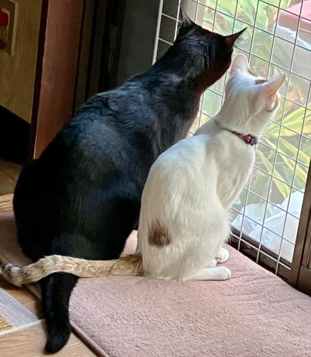 この2人はとっても仲良し! 特にフィガロ君がウチのトン君に会えると本当に嬉しそう☆*:.。. o(≧▽≦)o .。.:*☆ うちのトンくんは、フィガロの命の恩人ですからね。 この日は仲良く並んでお外見てました。 気づいたら2人のしっぽが自然にクロスしてて… これはもう反則級の可愛さ(*^◯^*) 思わずパシャリ!