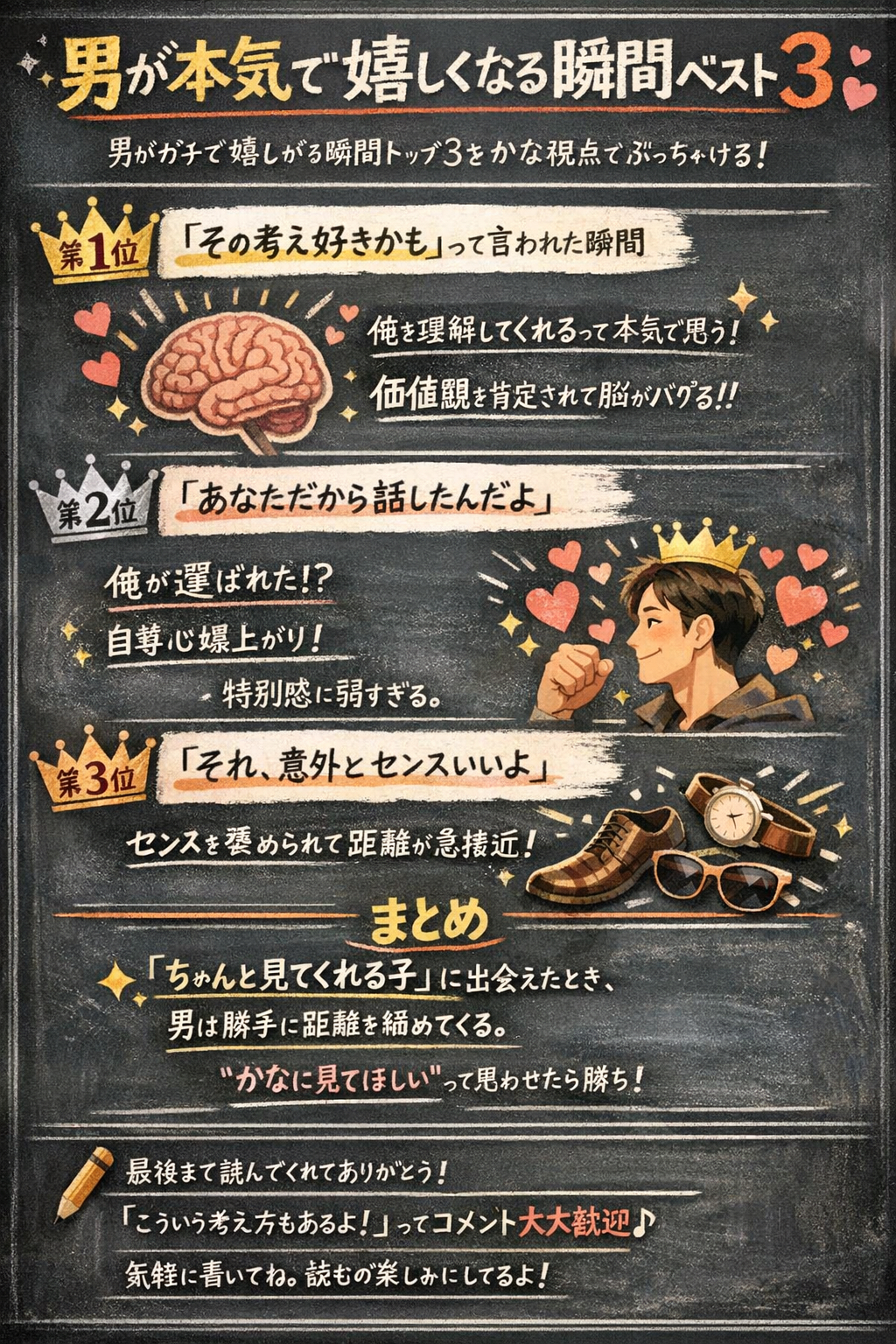 男って単純でしょ? …いや、そんな浅い話じゃなくてさ。 本当に嬉しい瞬間って、めちゃくちゃピンポイントなんだよね。 しかも本人は自覚してない場合もあるから、 そこに刺さると一発で態度が変わる。 今日はチャットで何万人も見てきた中で、 男がガチで嬉しがる瞬間トップ3を、かな視点でぶっちゃける。 第1位:「その考え好きかも」って言われた瞬間 これ、男の脳がいちばんバグる。 “考え方=その男自身” だから、 そこを褒められた瞬間、 「この子は俺を理解してくれる」 って思ってくれるケースが多い。 見た目の褒め言葉より効く。 性格より効く。 何よりも、“自分の価値観”を肯定された男が一番弱い。 第2位:「あなただから話したんだよ」 これ、ずるいくらい効く。 「周りじゃなくて、お前が選ばれたんだよ」 って言われて喜ばない男はいない。 自尊心が一気に跳ね上がって、 「この子をキープしたい」 「また来よう」 と思ってもらえるようになる。 男って“選ばれた感”に弱すぎる。 第3位:「それ、意外とセンスいいよ」 多くの男性が求めてるもの。 それは“センスの肯定”。 ・服 ・言葉選び ・価値観 ・行動 何でもいい。 センスを認められると、 「もっと褒められたい」って気持ちが出て、 距離が一気に縮まる。 ✨まとめ 男が本当に嬉しくなる瞬間って、 外見でもお金でもなく、 「ちゃんと見てくれる子」に出会えたとき。 たったこれだけで、 お客さんとの距離が自然と縮まる。 “かなに見てほしい”って思わせたら勝ち。 ✏️最後に 最後まで読んでくれてありがとう。 いかがでしたか? 「こういう考え方もあるよ!」 なんてコメントも大歓迎。 気軽に書いてね。 読むの楽しみにしてるよ。